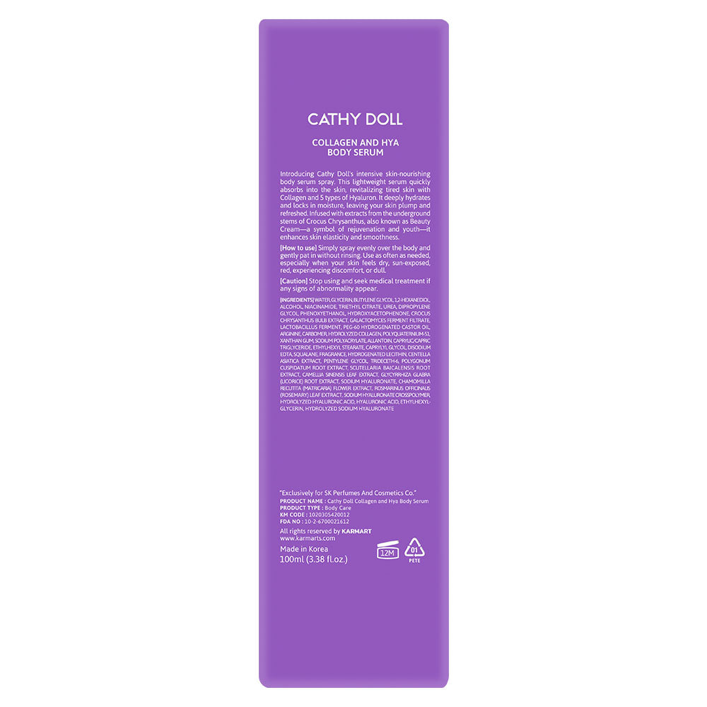 Introducing Cathy Doll's intensive skin-nourishing body serum spray. This lightweight serum quickly absorbs into the skin, revitalizing tired skin with Collagen and 5 types of Hyaluron. It deeply hydrates and locks in moisture, leaving your skin plump and refreshed. Infused with extracts from the underground stems of Crocus Chrysanthus, also known as Beauty Cream—a symbol of rejuvenation and youth—it enhances skin elasticity and smoothness.